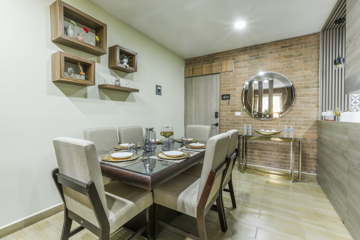 Promo: mezcal de cortesía + late check-out (sujeto a disponibilidad). Casa con alberca privada en el fraccionamiento más seguro de Oaxaca, a solo 15 min del Centro. Recámara principal con cama King y sofá cama; recámara 2 con dos matrimoniales y cortina de privacidad (se cruza para llegar a la principal). Cocina equipada, jardín, WiFi, A/C y estacionamiento. Ideal para personas que buscan confort. No fiestas. Capacidad 7 adultos y 1 menor.