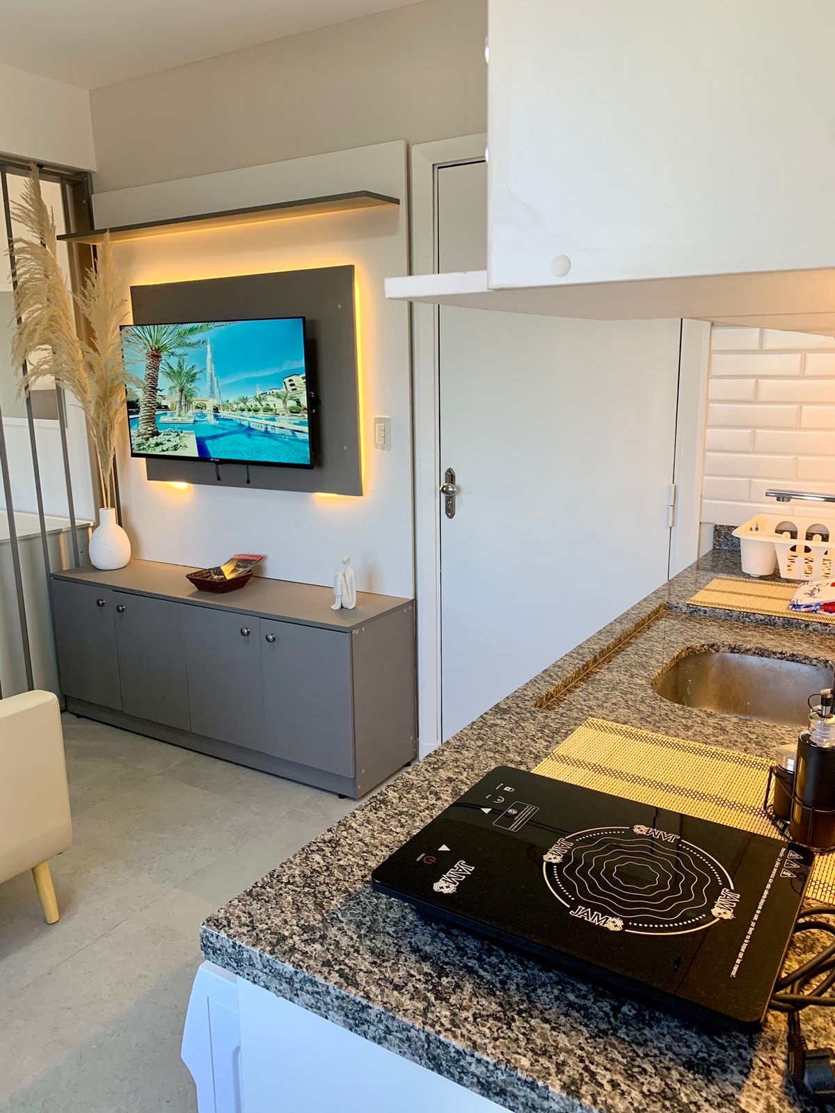 Monoambiente cálidamente decorado con baño privado, pequeño estar con sofá y comedor, placa de cocina, balcón propio. Edificio con guardia 24/7, estacionamiento bajo techo, rodeado de restaurantes, farmacia, tiendas de conveniencia, bares. Smart TV, jabón, toallas,ropa de cama, cocinita, ollas, microondas, A/C split, tendedero de ropa, heladera, cafetera, cubiertos, vasos, secador de pelo, enchufes para USB. Terraza con parrilla bajo pedido, con costo. Alojado en el corazón de Asunción.