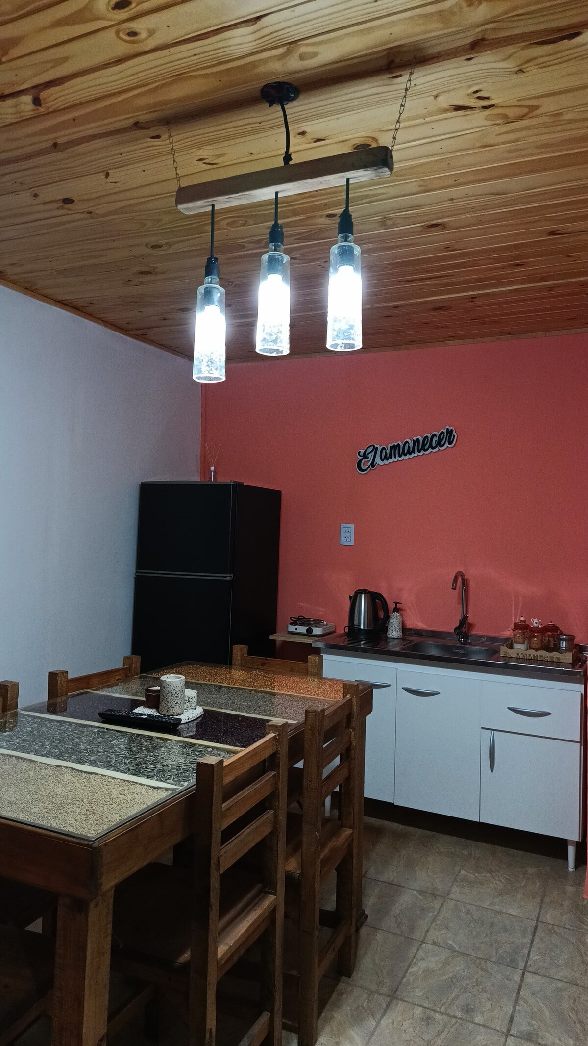 Tiene buena iluminación, casa recién pintada, paisaje natural, tiene un baño con ducha, tres camas individuales y una matrimonial, cocina totalmente equipada con cocina, heladera, tiene un juego de mesas y sillas en la cocina y otro juego de living en la sala de estar, cuenta con lugar para estacionamiento propio. Cerca viven los caseros del lugar que ofrecen como opción desayunos y comidas regionales.