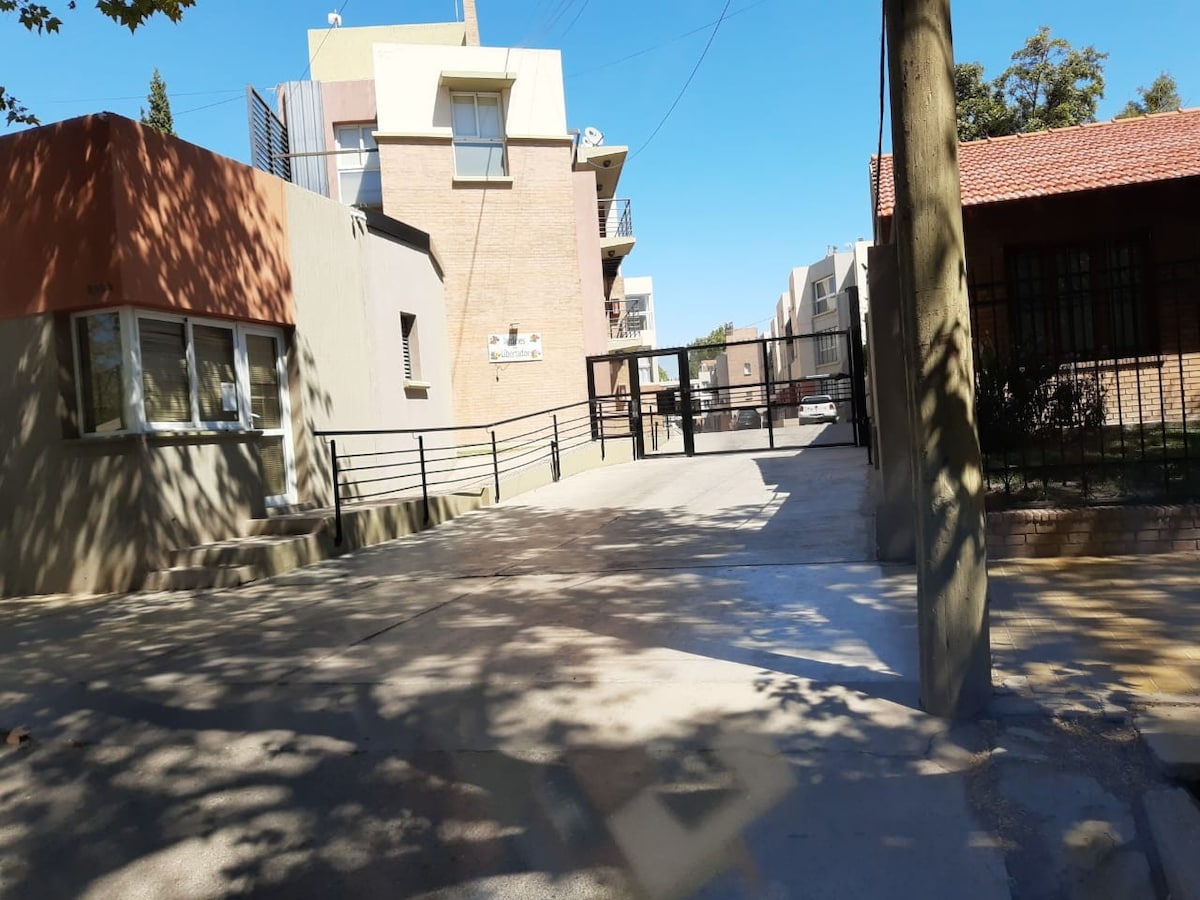 Dpto planta baja, una habitación, baño con bidet, cocina-comedor, bajo mesada, alacena, termo tanque eléctrico, microondas, horno y pava eléctricos, anafes, vajilla, lavarropas, heladera. Internet wifi, aire acondicionado frío-calor en dos ambientes. Cámaras de seguridad, cochera, portón corredizo automático, 2 literas de madera,sofá,sábanas,toallones,parrillero. Smart TV 43'', plancha, secador de pelo. A 20' del circuito del Villicum. A 5' del predio Costanera. Parada de colectivo en la entrada