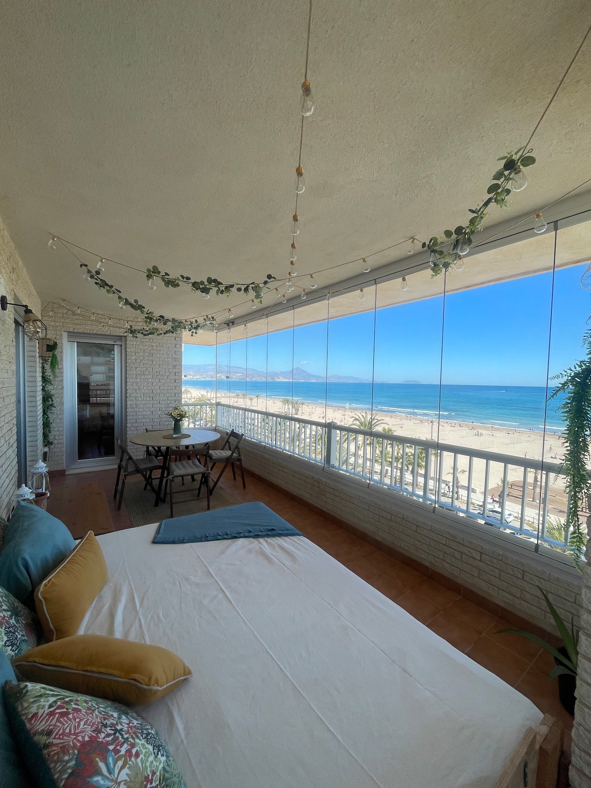 Precioso apartamento en primera línea de playa (salida directa al mar) con inmejorables vistas al mediterráneo. Ideal para parejas y familias con hijos. Prohibido fiestas y ruidos.Disponible para Largas Estancias. Consúltenos. Zona conectada con transporte público: TRAM y Autobuses con el centro ciudad. Todos los servicios: Restaurantes, Supermercados, Farmacia. Cuenta con una terraza frontal e impresionantes vistas al Castillo de Santa Bárbara; donde podrá relajarse observando las olas del Mar