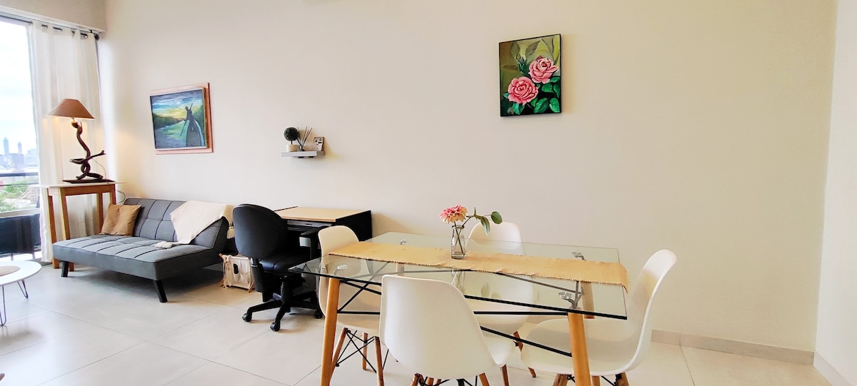 Moderno, tranquilo y acogedor, con domótica (Alexa), ideal para home office, parejas o turistas. Disfruta su vista increíble desde el balcón,TV con Netflix, WiFi veloz y cocina full equipada. Zona super tranquila, cerca de avenidas principales, transporte público y supermercado. El edificio ofrece lavandería,gimnasio, quincho y es Pet Friendly! Te abro las puertas de mi hogar con cariño, esperando que lo disfrutes y cuides.Reserva y vive la mejor experiencia en Asunción!
