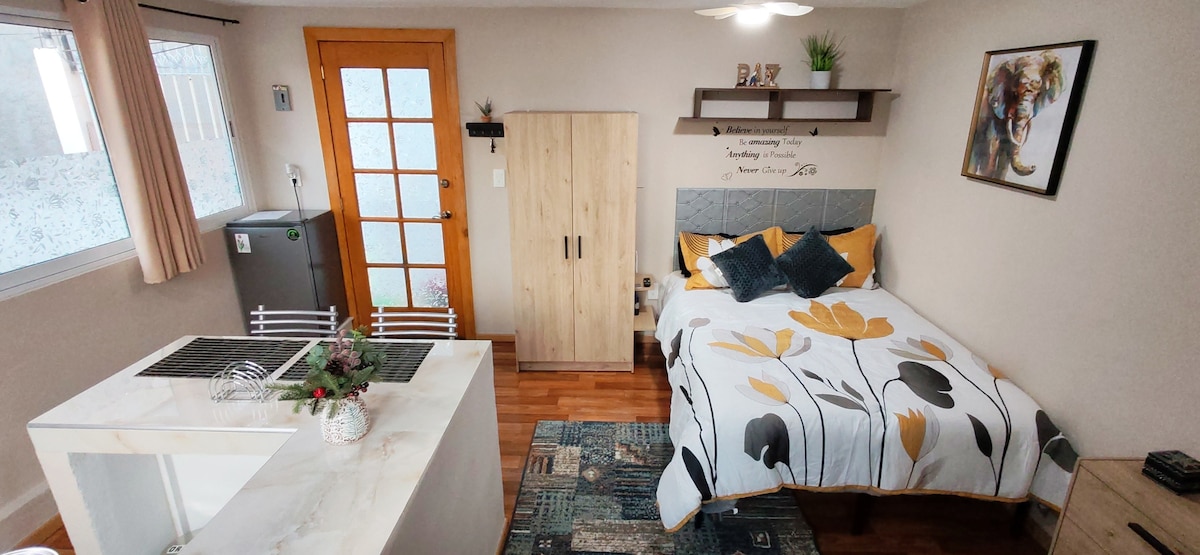 El alojamiento es un departamento independiente de la casa principal, con acceso propio. Cuenta con una habitación (2 personas, cama matrimonial); 1 estudio (con desayunador, escritorio, sillas y libreros); cocineta (sin estufa, solo con una hornilla eléctrica); baño completo; y 1 lugar de estacionamiento. Ubicada en la zona sur de la Ciudad de México, a 5 minutos del Museo Dolores Olmedo y del tren ligero la Noria, a 10 min de las famosas trajineras y el mercado de flores.