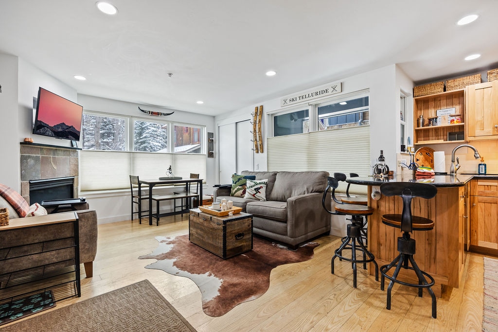 Descubre la mezcla perfecta de encanto rústico y comodidad moderna en este luminoso condominio de 1 dormitorio ubicado en el pintoresco Telluride Valley. A minutos de esquí de clase mundial en la estación de esquí de Telluride, este refugio de montaña es tu base ideal para aventuras alpinas. Camina hasta la góndola o toma el servicio de traslado gratuito para acceder rápidamente a la montaña. Después de un día de emoción, relájate en tu patio privado, acurrúcate junto a la chimenea de gas o relájate en la piscina climatizada al aire libre y las bañeras de hidromasaje.