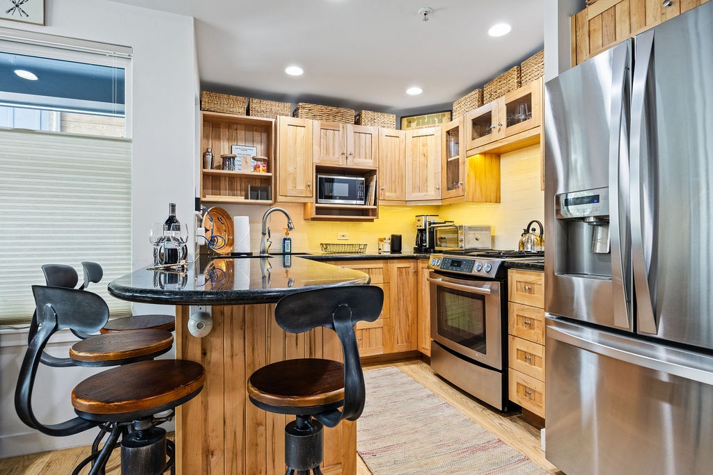 Te damos la bienvenida a Ridgeview Retreat at the Lorian, organizado por InvitedHome. Entra en este espacio luminoso y acogedor, con acabados contemporáneos para un ambiente moderno elevado. La entrada principal conduce directamente a la sala de estar con amplios asientos, una chimenea de gas y amplias vistas a la cresta. A la izquierda están la cocina y el comedor. En la cocina encontrarás hermosos electrodomésticos de acero inoxidable, una isla espaciosa con capacidad para cuatro personas y una nevera para vinos. La mesa de la cocina combina banco y silla