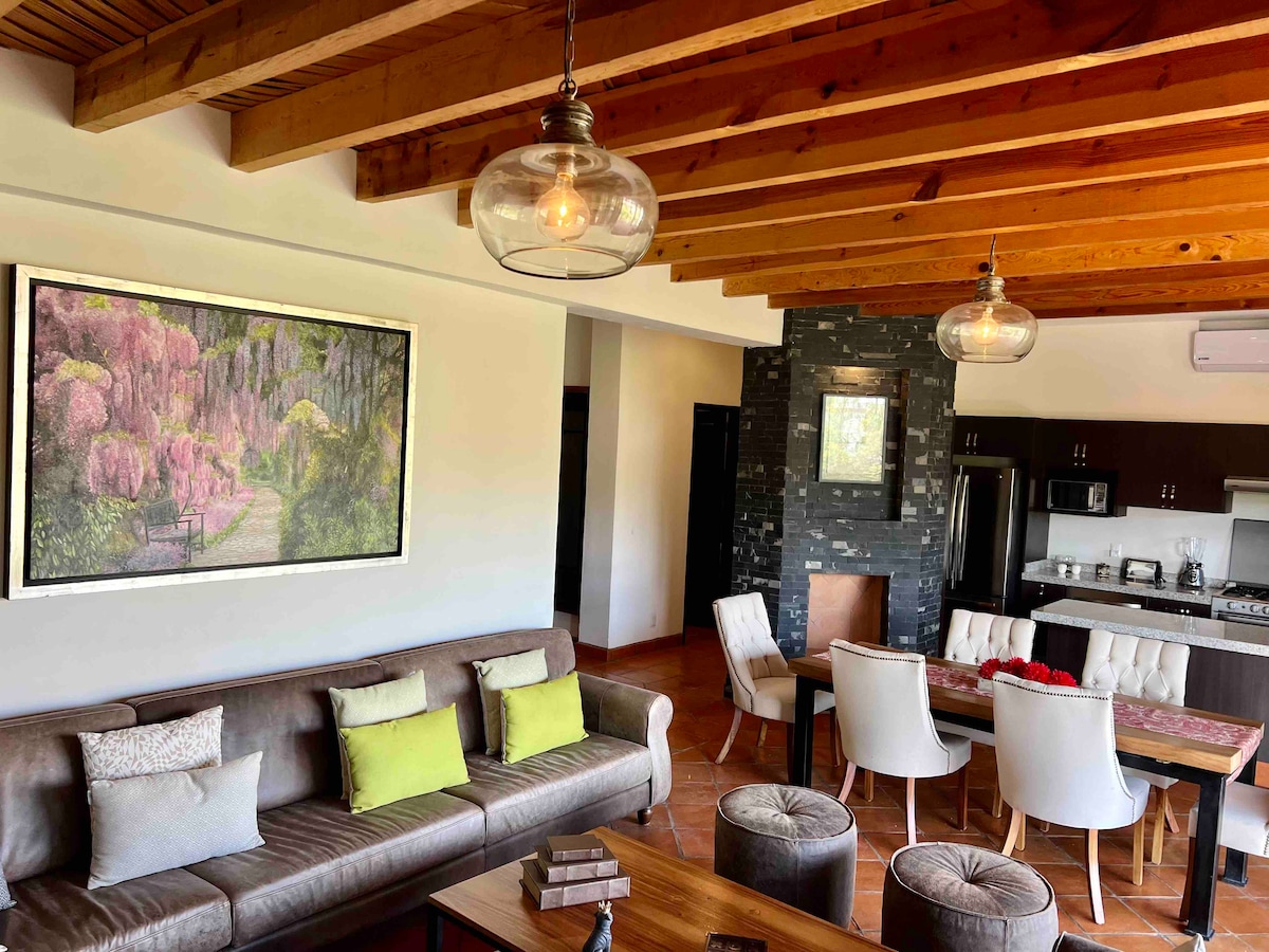 EL NIDO – Condominio moderno de 3 dormitorios/3.5 baños en Capilla de Piedra, San Miguel de Allende - Vistas panorámicas del horizonte de la ciudad al atardecer - Capacidad para 8 personas - Decoración tropical con temática de pájaros con pisos de mármol y vistas al horizonte. - Piscina, jacuzzi, sauna, gimnasio, canchas de ráquetbol y squash. - Wifi rápido (más de 100 Mbps), mini-splits de aire acondicionado, camas tamaño king. - Aparcamiento gratuito + traslado gratuito al centro. - Seguridad cerrada las 24 horas, los 7 días de la semana. - A 6 cuadras/15 minutos a pie de El Jardín. A 15 minutos a pie del Parque Juárez. - A 13 minutos en auto de Fabrica Aurora. - A 12 minutos en auto del Charco del Ingenio.