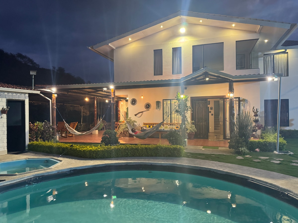 Diviértete con toda la familia en este alojamiento con estilo. Relájate con toda la familia en este tranquilo lugar y seguro para quedarse a descansar. Estamos a 300 metros de la vía principal. (Vía Malacatos - Ceibopamba). Es una casa recién construida con parqueo, piscina, jacuzzi, área BBQ, con una cocina bien equipada, dormitorios con cómodas camas.