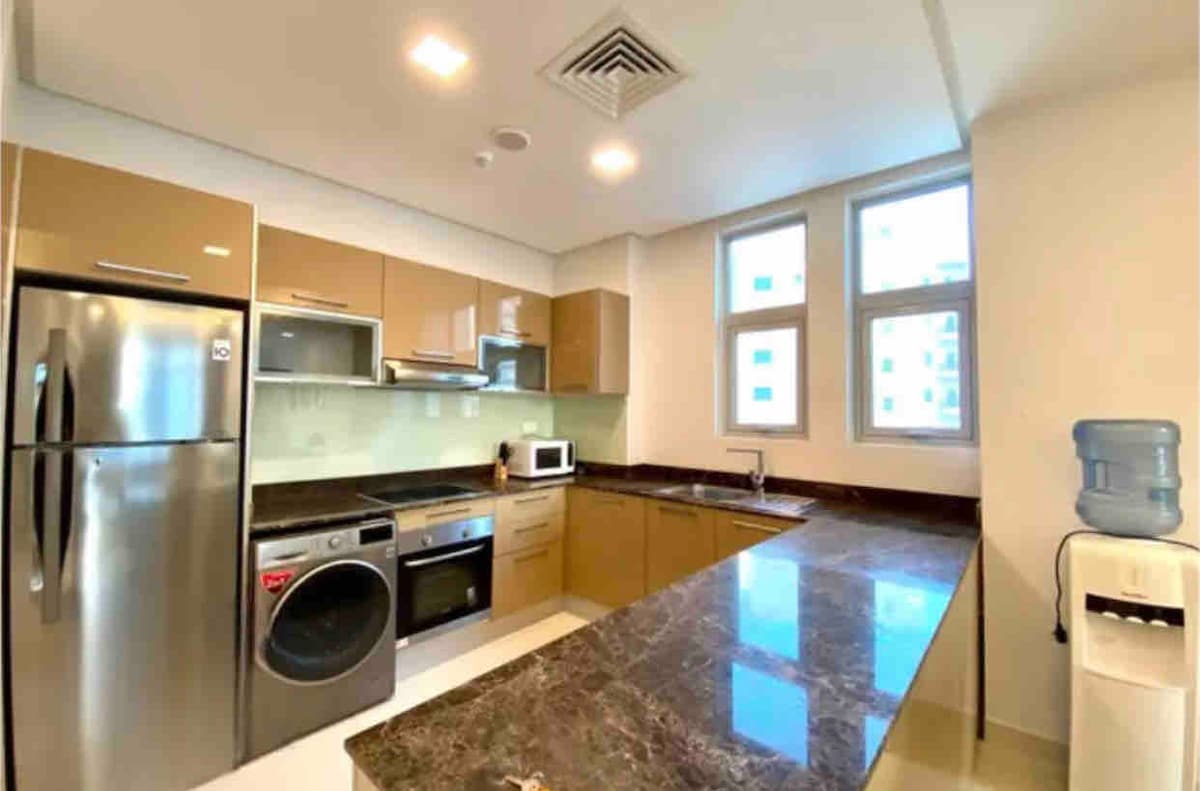 The apartment is located in Janabiyah area It is a quiet area away from the disturbance of the capital, and at the same time it is served by all needs, such as: a 24-hour supermarket, restaurants, and entertainment places. The area is the most suitable choice for families and everyone who likes to be away from noise, hotels and their activities Quiet and serviced area, close to King Fahd Causeway Liwan Complex : 8 minutes by car District 1 : 9 minutes by car Seef area : 15 minute by car
