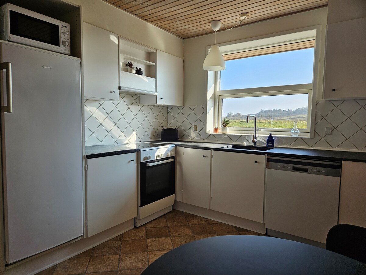 Cossy, authentic, non smok summer house with a huge terrace and great ocean view. The house has a nice, light and open kitchen / living room area, bathroom with a shower, 2 rooms with beds for 2 and 3 people. In addition 2 people can sleep in the living room on a comfortable pull out couch. A cosy automatic stove that heats the house even in the cold periods. The key box ensures easy and flexible check in and -outs.