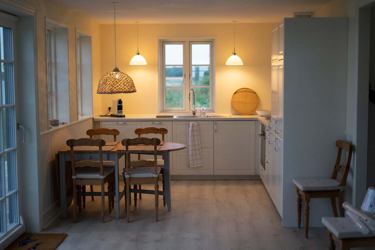 Nyd hygge og ro i ca, 50 m2 lys og lækker lejlighed under loftet i nedlagt kostald. 1 af i alt 2 lejligheder. Bygget i 2021. 2 soveværelser, stue med sovesofa, fuldt køkken, samt eget bad. Adgang til fælles pool. Ren idyl på landet, men med kun 2.5 km til gode indkøbsmuligheder, samt ca. 10 min i bil til fantastisk børnevenlig sandstrand. Hunde, katte og heste. Ejer bor på grunden, men i anden længe. Fibernet og tv-pakke. NYT 2025: Gameroom med bordfoldbold, bordtennis og retro spillekonsol.