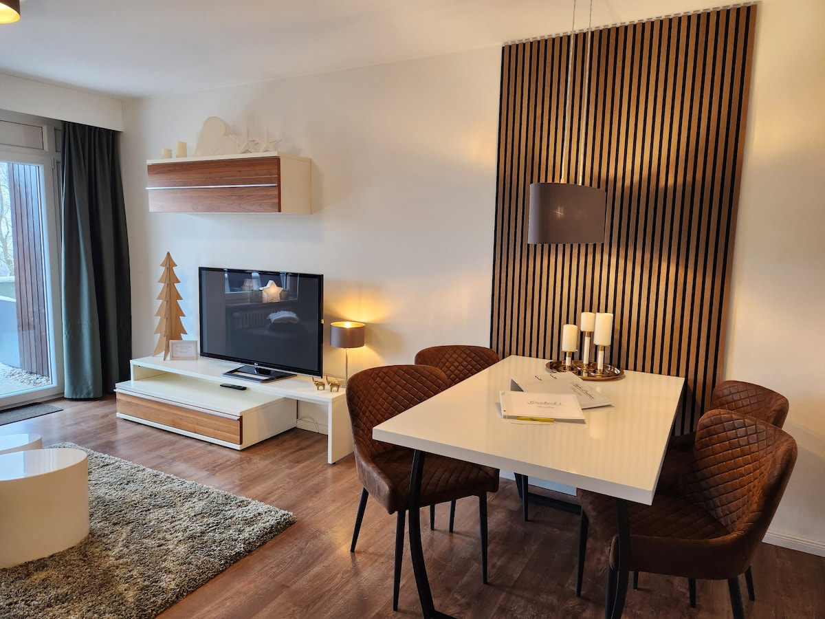 Nuestro apartamento tiene aproximadamente 70 m² de superficie habitable dividida en 3 habitaciones, pasillo y baño, un tamaño estupendo para 4 a 6 personas. La sala de estar (comedor, sofá/zona de televisión y cocina) está amueblada con cariño y es acogedora. El dormitorio con cama doble de 1,8 x 2 metros es muy amplio y tiene un acceso independiente, al igual que la sala de estar, al gran balcón orientado al sur (18 m²). Nuestro dormitorio está equipado con una cama de 3 pisos de alta calidad. Sauna privada para sentirse bien.
