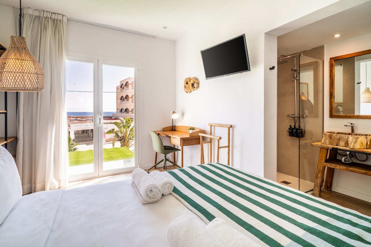 Por fin, una vista por la que vale la pena esforzarse. Amplia habitación con cama queen para profesionales que trabajan a distancia: comodidad, concentración y un entorno mediterráneo, todo en uno. Baño privado con jabones de cortesía, aire acondicionado, Wi-Fi de alta velocidad, televisión y espejo de cuerpo entero. Escritorio orientado al mar, el tipo de vista que le permite relajarse y concentrarse al mismo tiempo. Café Balboa de cortesía y desayuno continental todas las mañanas. Playa Es Canar a dos minutos. Te preguntarás por qué has trabajado desde casa.