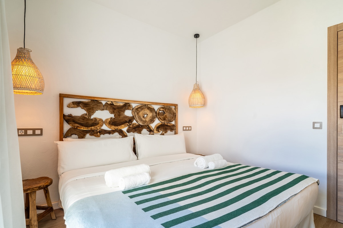 Superior Studio exclusivo en última planta con terraza privada y cama balinesa, solo hay dos como este en Marina Playa. Disfruta el lujo de relajarte bajo el sol, contemplar atardeceres únicos y vivir la brisa mediterránea desde lo más alto de Ibiza. Un refugio de glamour y tranquilidad donde cada momento se convierte en una experiencia inolvidable, pensado para quienes buscan privacidad y el encanto auténtico de Ibiza.