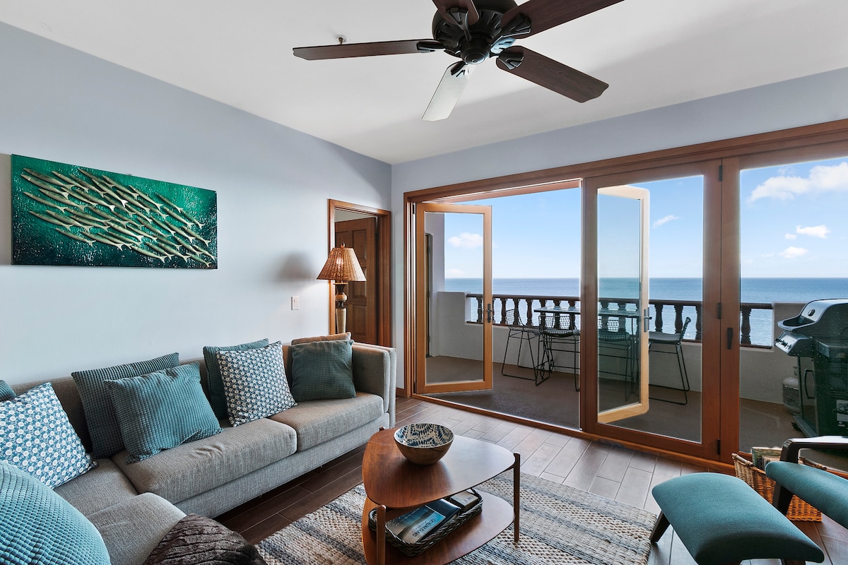 ** ¡Pregúntanos sobre el registro anticipado! ** Bienvenido a Haven, el popular apartamento prémium de Hamilton Cove con impresionantes vistas al mar sin obstáculos. Nuestro apartamento de la esquina superior tiene ventanas adicionales y un balcón de 35 pies. ¡A solo 21 escalones de la cima! ¡Electrodomésticos nuevos, televisores de 65" y 55", wifi de clase empresarial, chimenea, techos abovedados, carrito de golf y lavandería! No hay vecinos encima de BD+LR. Disfruta de la piscina, spa, gimnasio, saunas, playa, minigolf, canchas de tenis, parque infantil y voleibol de playa. Máximo 4 personas a menos que 1 huésped sea menor de 1 año.