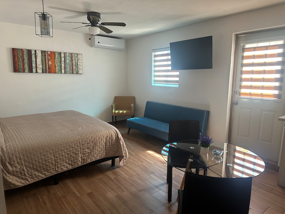 NO HAY ESCALONES. Mobiliario funcional . Cocineta con parrilla eléctrica para cocina ligera o sencilla . Mini refrigerador. Microondas y cafetera . Baño independiente. Sofá cama para tercer huésped. Con patio independiente. Boiler externo. AC frío/calor. TV 32 in. Netflix. Wi fi alta velocidad. TINACO externo en caso de corte de agua. Cámaras externas de seguridad. Restaurants, bancos, clínicas, parques cercanos.