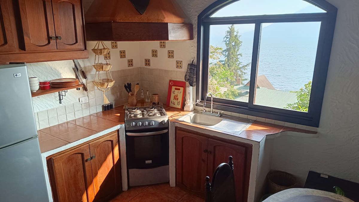 Moderna se encuentra con Maya, esta casa frente al lago, a 10 minutos en barco de Panajachel, es un lugar único. Dos dormitorios con puertas correderas a balcones con vistas al lago y a las montañas circundantes. Tipo loft en la planta baja con salón/comedor y cocina para compartir tiempo de calidad juntos mientras contemplas el lago. A poca distancia a pie de restaurantes para cenas con velas, kayak/subalquiler y caminatas a lo largo de senderos de montaña o la orilla del lago. Privado pero seguro y accesible. ¡Prepárate para una estadía encantadora!