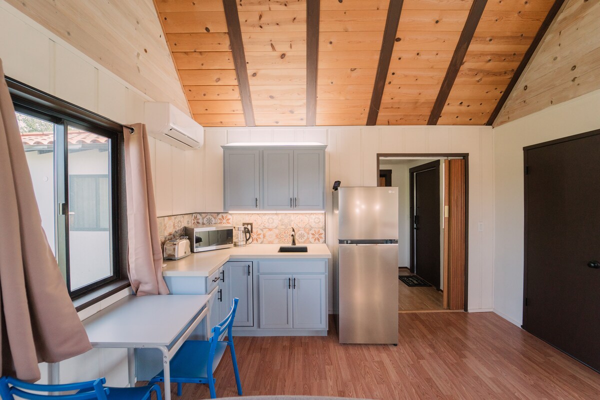 Bungalow privado pequeño y acogedor de 1 dormitorio/1 baño. Este espacio cuenta con un sabor a playa latinoamericana, suelos de baldosas españolas y muebles de madera. Cocina americana con quemador de inducción y horno tostador extragrande (sin cocina), nevera de tamaño completo, asientos de patio privado, sombrilla y plantas tropicales. Baño con una pequeña ducha. Dormitorio con cortinas, armario completo y cama tamaño queen. La sala de estar tiene un sofá cama con colchón doble para el tercer huésped. Por favor, lee «otros detalles importantes» antes de reservar.