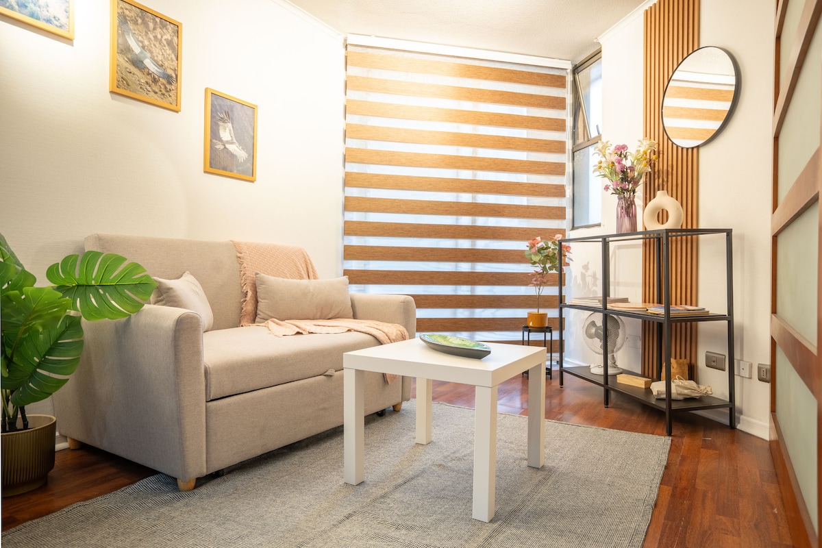 Encántate en nuestro departamento estudio cercano al centro histórico de Santiago pensado en tonalidades del sur de Chile. Disfruta de todas las comodidades de este alojamiento silencioso y completamente equipado para que tu estancia sea lo más confortable posible. A pocos minutos a pie del metro Línea 5 (5min) y Línea 1 (8min) para movilizarte más fácilmente por la ciudad. Estudio 1 hab. 1 b y terraza Si requiere Parking podemos alquilar 1 lugar al interior de las instalaciones del condominio.