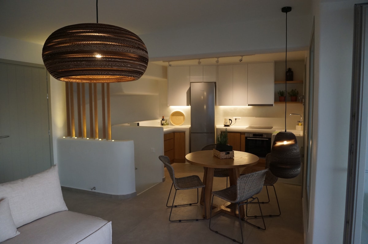 Abre las contraventanas azul marino y deja entrar la brisa refrescante, luego prepara un refrigerio en la encimera de hormigón de la cocina urbana en un refugio frente al mar. ¡Entra en la espaciosa y frondosa terraza para disfrutar de unas tranquilas bebidas al atardecer con vistas panorámicas al mar! El apartamento está situado junto a una playa de arena para nadar por la mañana y a 2 minutos a pie del centro de Naousa y su plaza principal. A pocos pasos hay tiendas, restaurantes, bares y clubes, ¡pero la zona es muy tranquila y silenciosa!