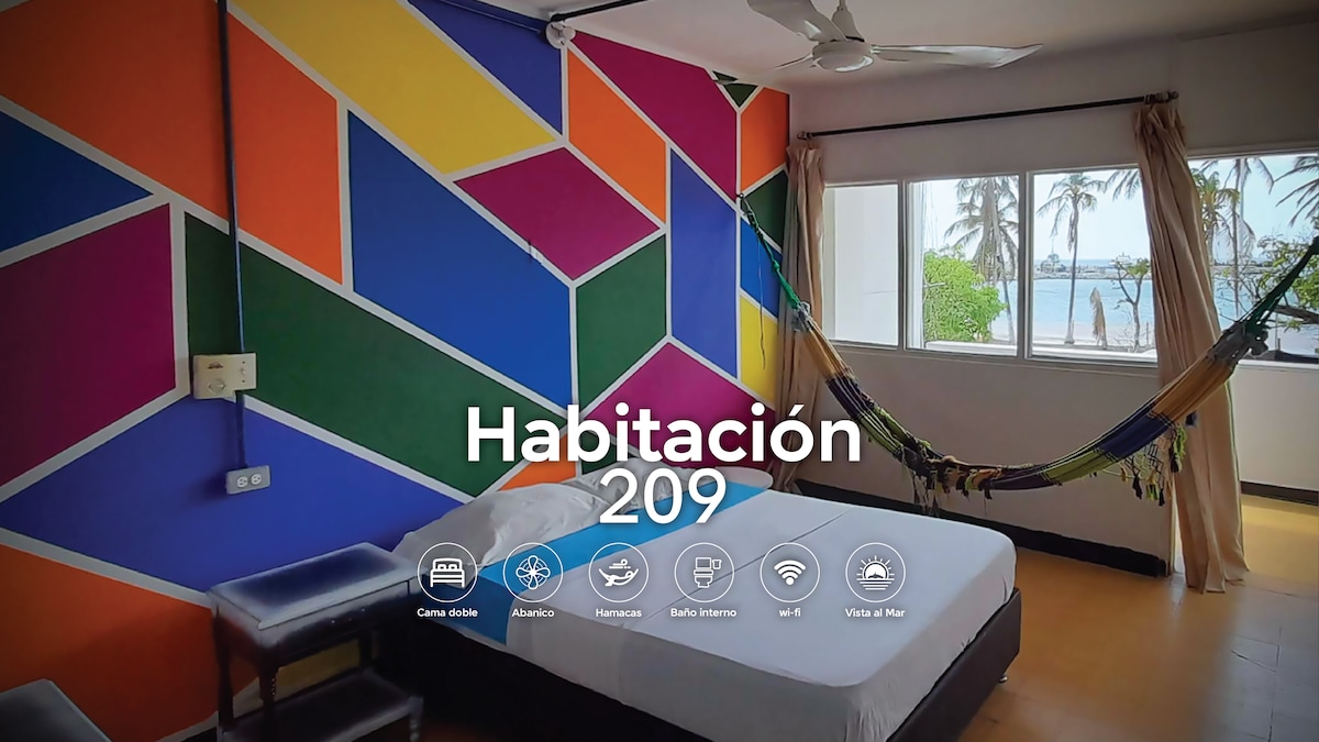 ¡Un espacio especial con alma caribeña! Nuestra habitación doble con aire acondicionado ofrece el equilibrio perfecto entre confort y un diseño artesanal único. Rodeado de colores vibrantes y detalles auténticos, relájate en la terraza principal mientras disfrutas de atardeceres espectaculares. Cada espacio de nuestro hotel es diferente, pensado para desconectarte y llenarte de inspiración. A menos de 5 minutos caminando de la playa de Taganga ¡Te esperamos!
