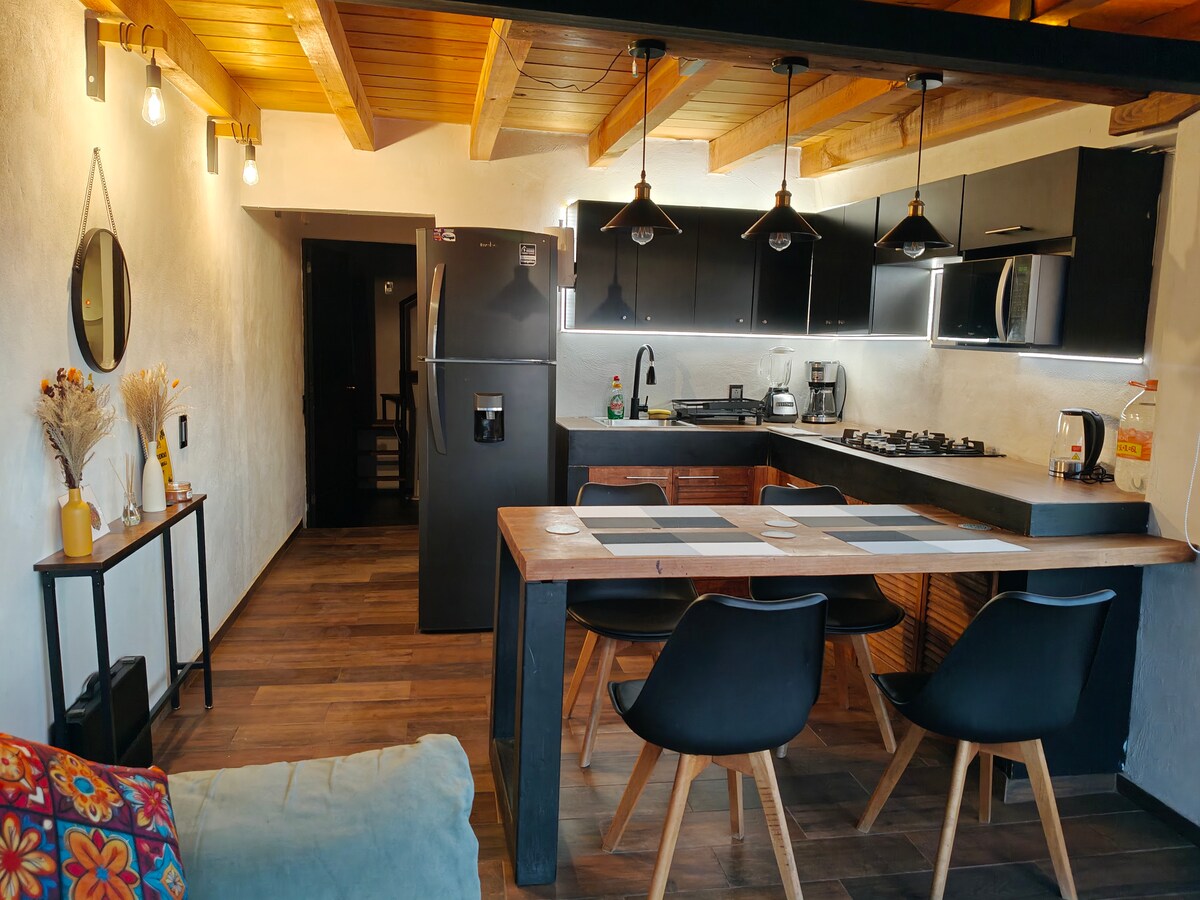 Desconecta de tus preocupaciones en este espacio tan amplio y sereno, Loft abrazado por los árboles. En medio de las montañas de Valle de Bravo, ideal para parejas, pero puede alojar más personas en cómodos sofá cama de la sala de estar . Cuenta con terraza, fogatero, dos niveles y estacionamiento propio. Acceso por caminos de piedra y terracería; a 20 minutos del Centro.