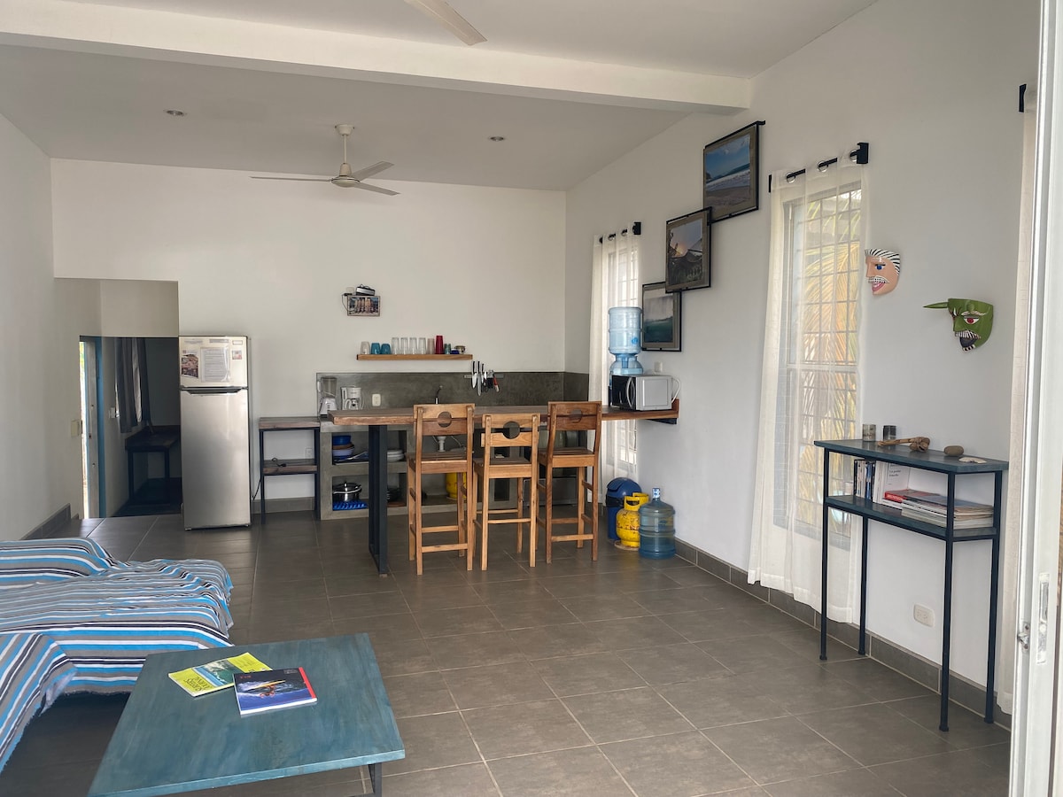 Relájate en este espacio tranquilo y elegante. Hermosa casa nueva justo frente al océano. Te quedarás en el primer piso. La casa tiene una piscina compartida. Un dormitorio con una cama tamaño king y un gran sofá cómodo en la sala de estar que puede acomodar a otro huésped. La casa tiene cocina totalmente equipada, internet rápido y aire acondicionado en el dormitorio. La ubicación es la mejor que puedes tener en Popoyo, hay lugares para surfear a poca distancia, restaurantes y estudios de yoga cerca.