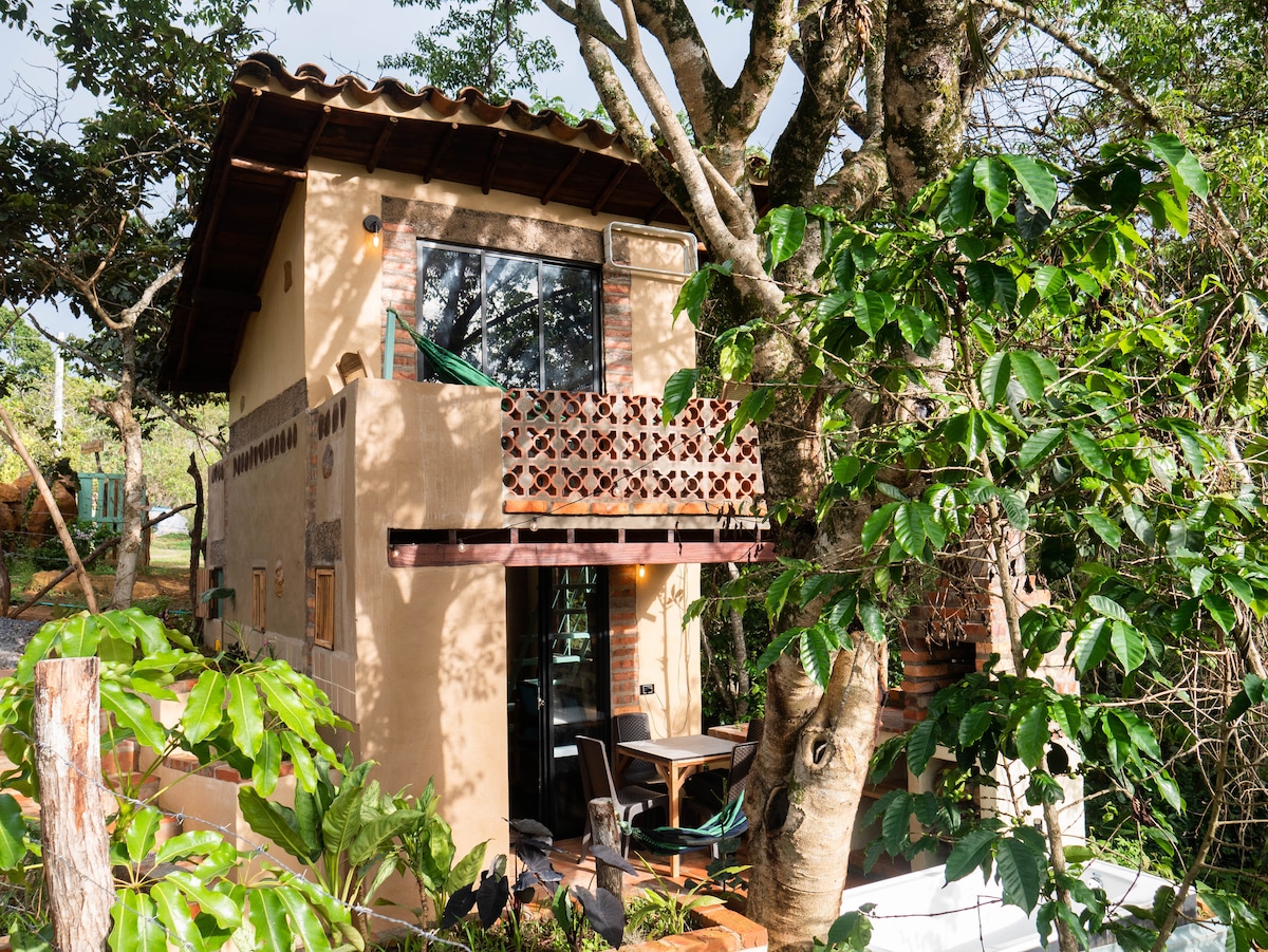 Hermosa casa de bahareque ubicada a 5 km del pueblo, de media hectárea y arboles frutales para el consumo. Cuenta con dos casas, en una encontraras el cuarto principal con su hamaca y en la otra la cocina. El baño es al aire libre lo que hace la experiencia única. Vista hacia el pueblo, dotado sin TV, especial para compartir en tranquilidad y desconectar. Importante: Solo hay una cama, y otra inflable sencilla. Apto para llegar en mototaxi, 4x4 o un carro alto fuerte, debido a que es campo.