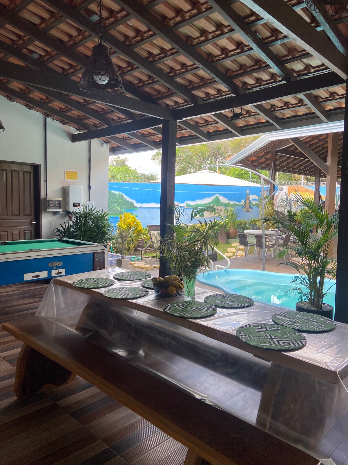Relájate en este espacio tranquilo y elegante... Casa grande y boscosa, con 02 habitaciones con aire acondicionado (una suite con 02 camas dobles) y un dormitorio sencillo (con 01 cama doble, 1 cama individual y 3 colchones individuales adicionales). Balcón con propietarios de hamacas. Mobiliada con todos los utensilios domésticos. Garaje para 3 coches, baño externo. Piscina, barbacoa, mesa de billar, pozo artesanal, ducha eléctrica, rejilla, valla eléctrica, puerta electrónica, cámaras de seguridad, internet y cielo.