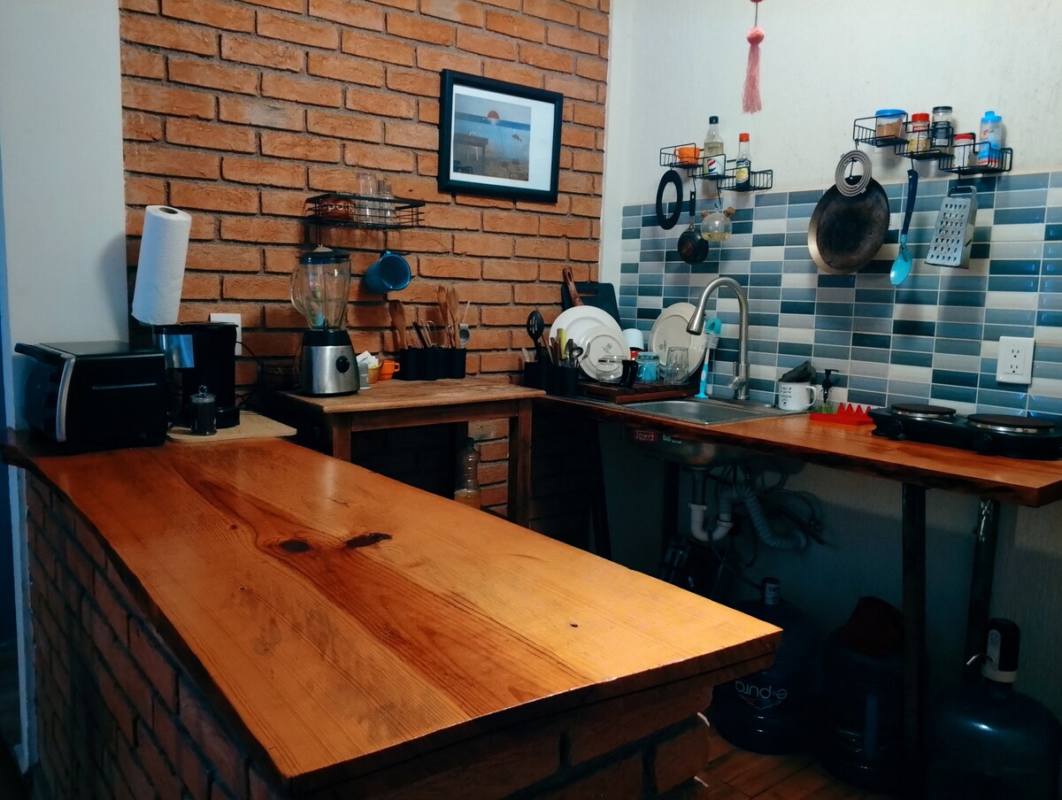 La casa es un espacio cálido y fresco de arquitectura colonial, cuenta con una habitación con baño privado, cocina, sala y comedor. Durante el día se encuentra en calma y en la noche se llena de vida. La entrada es independiente. The apartment is a fresh space with colonial architecture, it has a bedroom with a private bathroom, living and dining room. During the day it's calm and at night it comes to life.