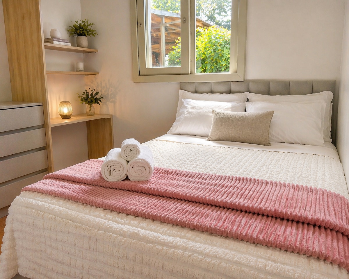casa para dos personas con un dormitorio y una cama doble con sábanas, almohadas, mantas, toallas, aire acondicionado y TV. Cocina equipada, cerca del centro, hospitales, farmacias, entrega, mercados, gimnasio, con parada de autobús cerca si es necesario. Alojamiento completo con todo lo necesario para tu bienestar. Aceita pet.