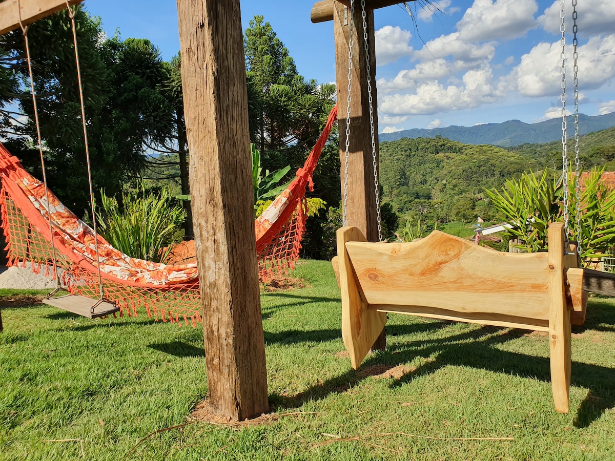 Bienvenido a nuestra posada de montaña, entre Santo Antônio do Pinhal (a 6 km) y Campos do Jordão (a 10 km de la entrada principal). Estudios privados y cómodos en medio de la montaña. La vía del tren atraviesa la propiedad, lo que le confiere un encanto especial. La zona exterior todavía está en obras, pero las habitaciones están listas para recibirte con cariño. ¡Un remanso de paz, naturaleza y buena energía! (Habitación de 30 m²)