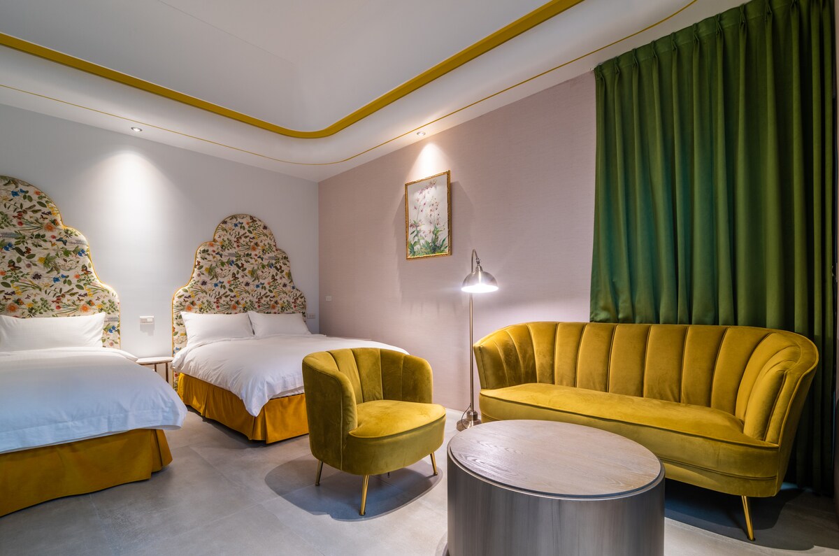 充滿粉色氛圍與山景視野的情調雙人房,擁有柔和光線與溫暖配色,是情侶與姐妹旅遊的熱門選擇。房內空間乾淨舒適,拍照效果極佳,窗外的山景讓房間更具療癒氣息。每日提供以皇家哥本哈根瓷器呈現的熱門早餐,精緻又美味,是旅客一致讚賞的入住理由。民宿設有電梯,前往羅東夜市約 15 分鐘,附近景點步行可達,是想要放鬆、增進感情或拍美照的最佳房型。