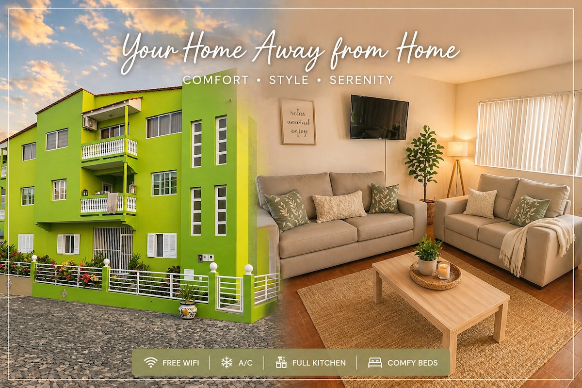 Brand-new luxury Airbnb featuring a king-size bed, a comfortable pull-out couch, a dining table, hangers for storage, a ceiling fan, a coffee maker, a mini fridge, and a microwave, along with complimentary water, coffee, milk, sugar, and wine. The bathroom is newly renovated. Guests have access to a warm and inviting shared courtyard area. Located only 5 minutes from the airport, a 10-minute walk to the beach, and just moments away from a hospital, police station, restaurants, and local shops.