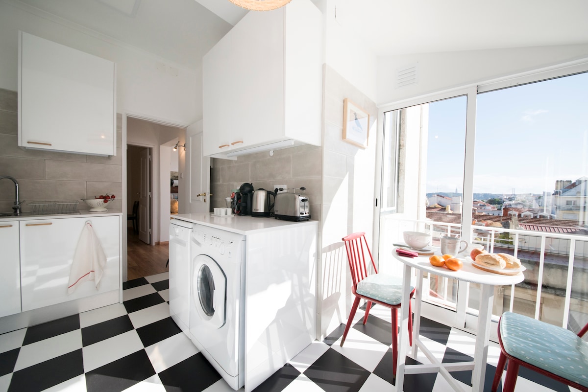 Elegante apartamento de diseño retro en el barrio de Rato de Lisboa, un espacio luminoso y privado para 2–3 huéspedes con vistas abiertas a la ciudad y sin vecinos enfrente. - Cama tamaño queen y aire acondicionado - Wifi de alta velocidad y espacio para trabajar. - Smart TV y cerradura inteligente (registro de entrada las 24 horas) - Lavadora en la unidad - Cocina totalmente equipada con cafetera Nespresso - Fácil acceso a pie o en transporte público