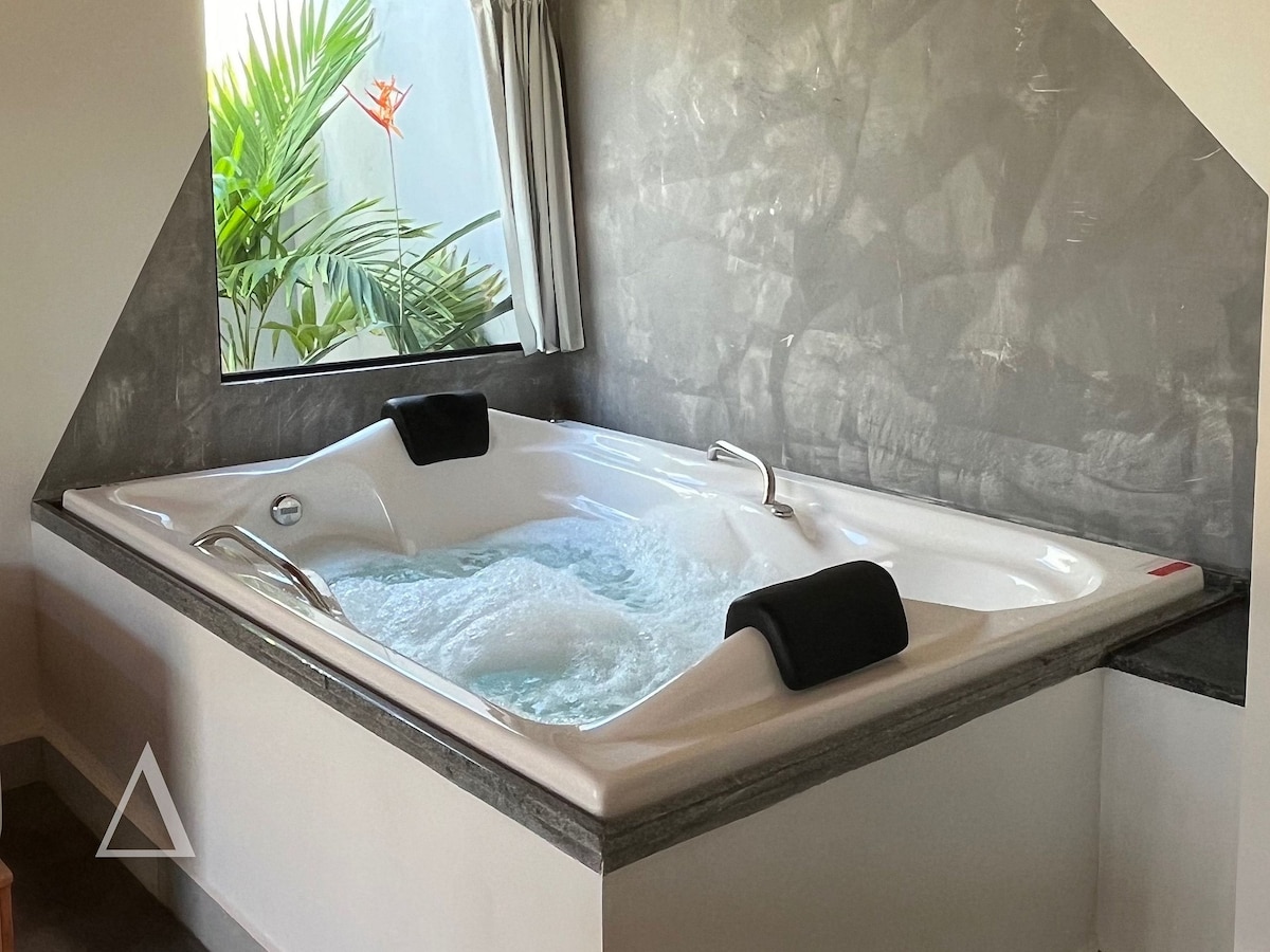 Encantadoras casas con jacuzzi privado, baño con jardín interior, cocina totalmente equipada y oficina en casa. Para mayor comodidad, ofrecemos todo del más alto nivel: ropa de cama Trussardi, secador de pelo profesional, freidora de aire, Nespresso, etc. Tiene bonitos restaurantes alrededor que puedes caminar por ahí. Para que tu estancia sea aún más agradable, no cobramos ninguna tarifa de limpieza, pero hacemos limpieza diaria (excepto los sábados) durante tu estancia.