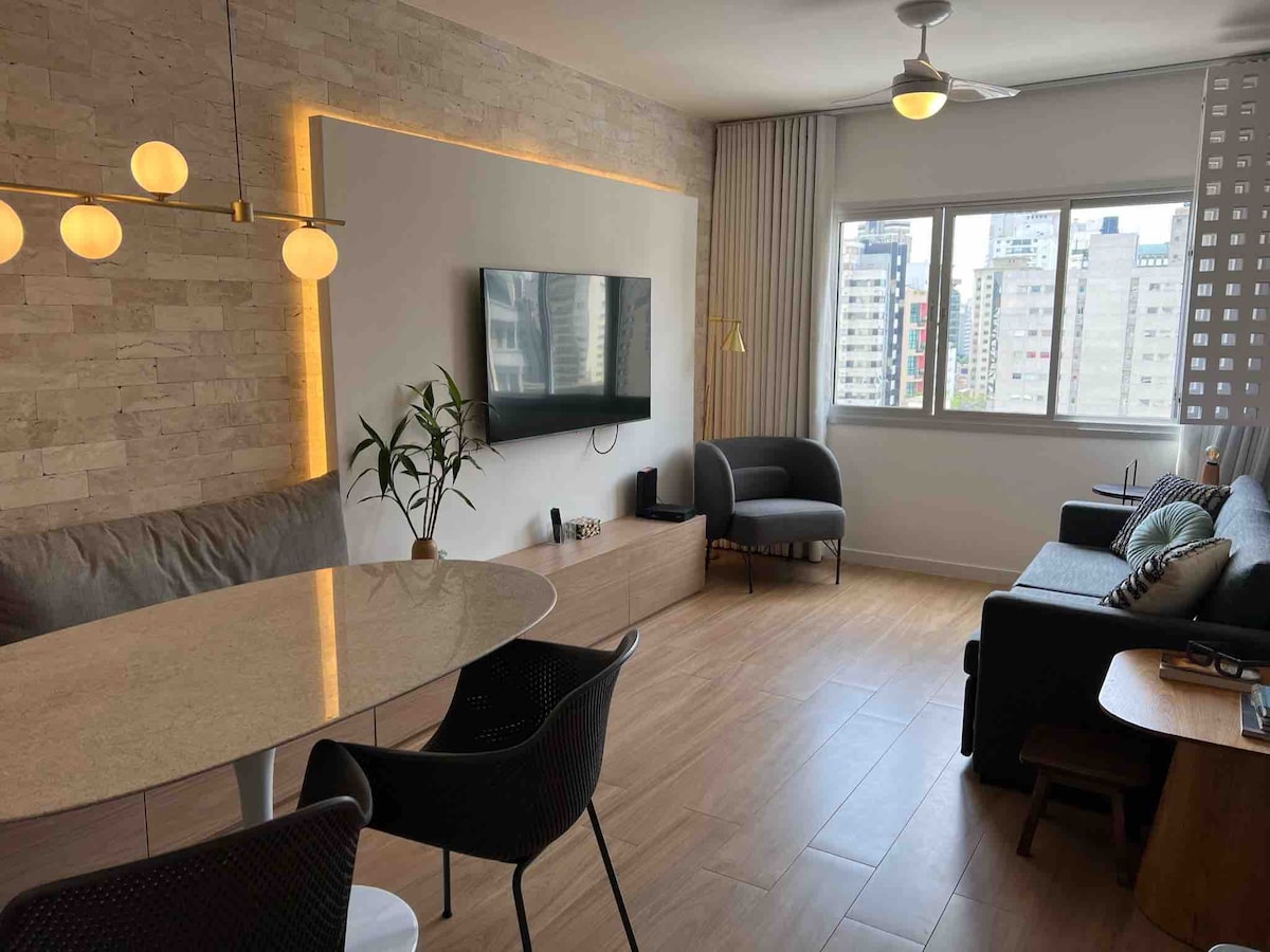 Bienvenidos y siéntanse como en casa. El piso es nuevo, diseñado especialmente para vosotros y tiene una decoración impecable, muy práctica para el día a día. ¡La vista es espectacular! El piso está en la 28ª planta. Estamos en una excelente ubicación en São Paulo, en el barrio de Pinheiros, con restaurantes, supermercados y panaderías muy cerca. Tiene 40m2 con 1 habitación y 1 baño. A poca distancia de la estación de metro Fradique Coutinho (sólo 2 cuadras).