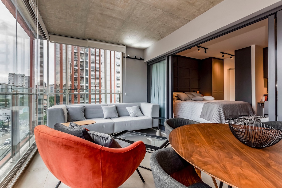 Estudio boutique con una de las vistas más bonitas de la ciudad de São Paulo. A 2 minutos a pie del metro. Cocina totalmente equipada con nevera escondida por una puerta de madera. Wifi, aire acondicionado y TV inteligente de 55 pulgadas. Registro autónomo con cerradura electrónica inteligente. Juega al tenis o ve al gimnasio y relájate en las piscinas (al aire libre o cubiertas climatizadas) y saunas (húmedas o secas) después. El área común también incluye espacios de coworking y lavandería. Los visitantes deben estar previamente registrados en la recepción.