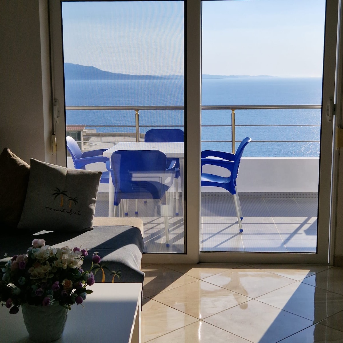 Tu familia estará cerca de todo cuando te hospedes en este lugar céntrico. El apartamento es fresco y ventilado. Cuenta con dos dormitorios y una sala de estar bastante grande comunicada con una cocina equipada para todas sus necesidades. Se encuentra en Saranda, en la calle principal, en el sexto piso de un edificio con ascensor. También tiene un gran estacionamiento propio en el garaje del edificio. Hermosas vistas panorámicas al mar, la ciudad de Saranda y la cercana isla de Corfú.