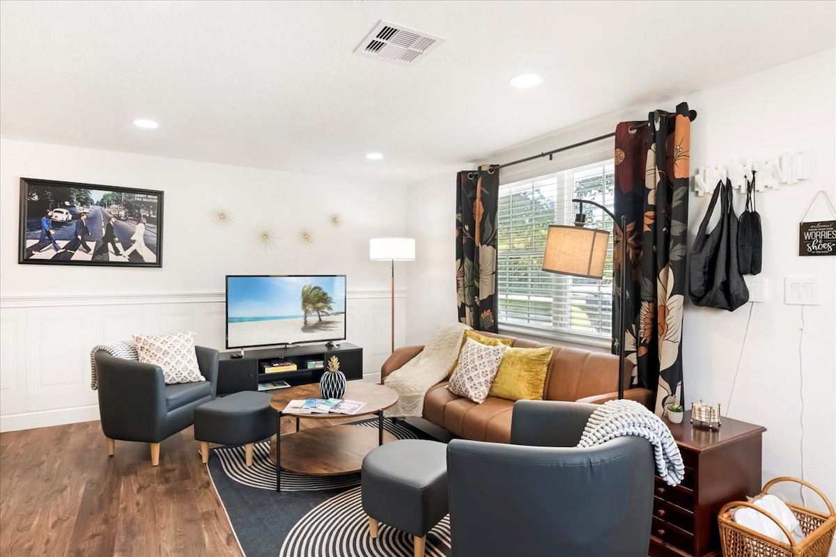 Step into Iconic, a glamorous vintage escape inspired by the legends who vacationed in Florida’s golden age. Enjoy bright retro décor, themed bedrooms, a record player, a sunny kitchen, and a lush outdoor lounge with dining, BBQ, and cozy fire pit. It’s a stylish, inviting getaway where Old Hollywood charm meets breezy tropical living.
