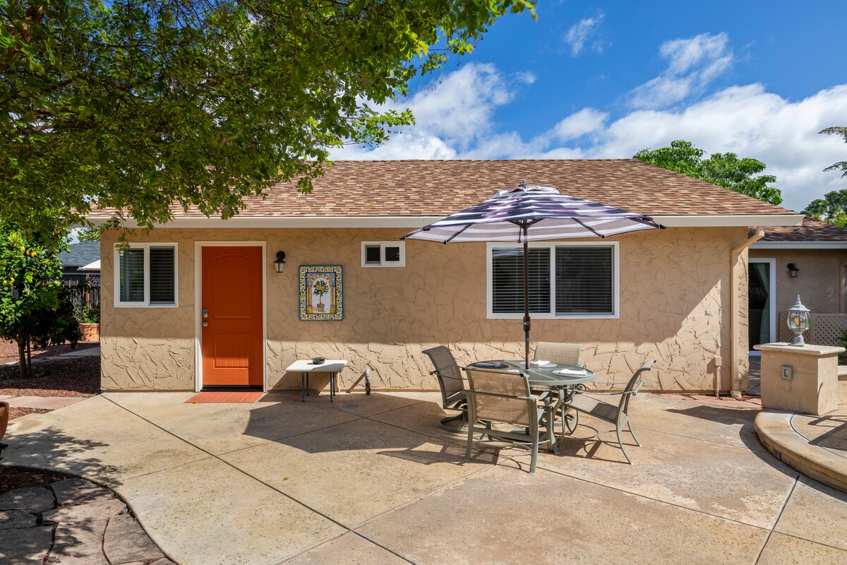 ¡Vacacionistas, familias extendidas, viajeros de trabajo con Internet rápido! ¡TODAS las comodidades y cocina gourmet! Tarifa opcional de configuración de la segunda cama de tamaño completo: factura separada para la tercera persona. Cocina gourmet totalmente abastecida, electrodomésticos de tamaño completo; ¡los pequeños también! Baño completo: ¡gran ducha a ras del suelo con 2 accesorios de cabezal de ducha! Bidé y todos los servicios. Patio, fuente de agua, sillas Adirondack, mesa de bistró, ducha al aire libre: disfruta de forma privada. ¡Nombrado para proporcionar la máxima funcionalidad y relajación!