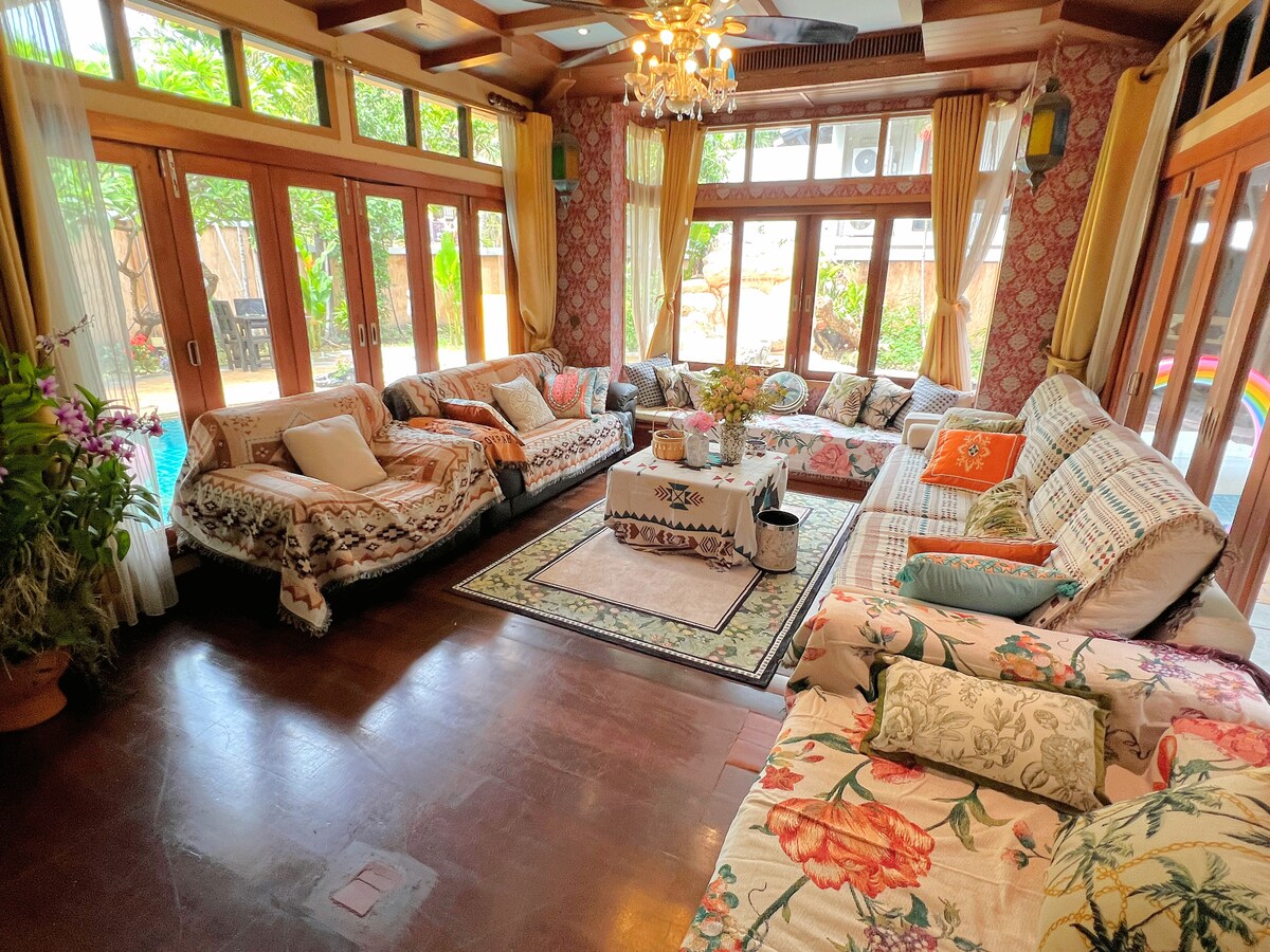 En la bulliciosa ubicación de Jomtien Beach, a 1 minuto a pie de la playa, cerca de la tienda 711, hay una piscina especial para villas, se pueden celebrar fiestas, 4 dormitorios con capacidad para más de 10 personas y hay un tatami, y también hay una cama supletoria. No hay ningún problema para alojar a más de 10 personas. , decoración de estilo tailandés y hay muchos restaurantes de celebridades en línea cerca de villas