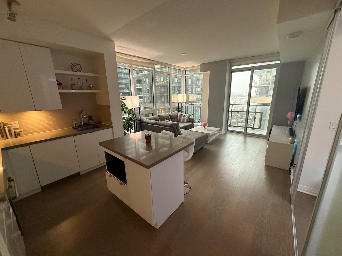 Bienvenido a nuestro moderno, acogedor y completamente surtido apartamento en Toronto con una cama tamaño king, ¡perfecto para familias o grupos pequeños! - A poca distancia a pie de la Torre CN, el Acuario Ripley, el TIFF y el Rogers Centre. - A pasos de Union Station (TTC, VIA Rail, UP Express) - 4 minutos a pie de Lakeshore - LCBO, Longo's, Starbucks, Bank están justo en tu edificio - Situado junto al Scotia Bank Arena - Conectado a Toronto PATH - Estacionamiento gratuito. - Wifi rápido. ¿Tienes alguna pregunta? ¡Estoy a solo un mensaje de distancia!
