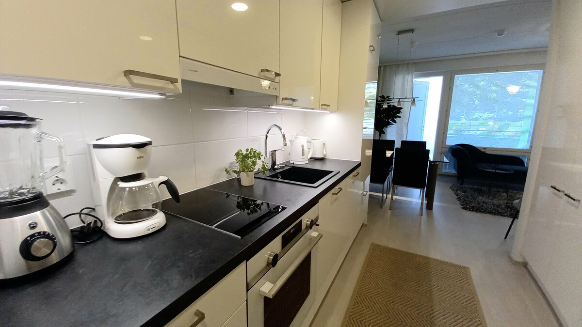 Apartamento tipo hotel totalmente equipado, recién reformado y justo al lado del centro comercial Sello. - Apartamento de 48 m2 en el sexto piso, con ascensor. - Interior diseñado por un diseñador de interiores. - Todas las comodidades modernas, incluida sauna y balcón. - Acceso al centro comercial Sello también a través del aparcamiento. - Aparcamiento gratuito a 500 m y wifi rápido. - Conexiones frecuentes de autobús, tren y tren ligero desde el centro comercial. * Tren al centro de Helsinki en 13 minutos * A 20 minutos en coche del centro de Helsinki