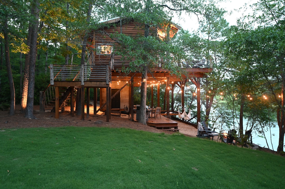 Esta lujosa cabaña en un árbol, enclavada en 5 acres de campo arbolado, es un refugio perfecto para relajarse, rejuvenecerse y refrescarse, y se encuentra a 1,5 horas al este de Dallas entre dos lagos. Ya sea que te relajes en el hermoso cubículo con cama tamaño king, descansando a 8' por encima del suelo del bosque rodeado de almohadas y mantas en una enorme hamaca de malla de 6' x 12', o tomando un baño o una ducha de efecto lluvia en la bañera semicerrada, esta romántica casa del árbol es donde el lujo y la comodidad se encuentran con la diversión y la fantasía.