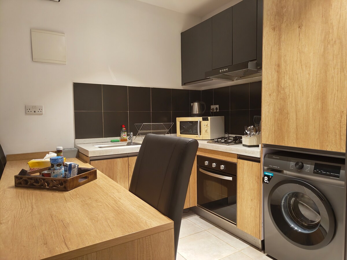 The apartment offers a tastefully decorated open plan living room with fully fitted kitchen, including induction cooking hub, oven, microwave and fridge/freezer. A washing machine is one of the additional useful amenities. Sitting area with sofa and Smart TV. The master bedroom with king bed has access to its own en-suite bathroom. A second modern and spacious bathroom has a walk-in shower, wash basin and toilet and is adjacent to the second bedroom.