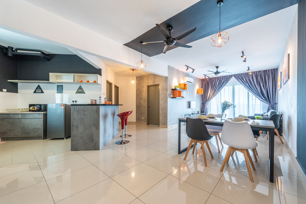 StarSuiteAC: ¡Alojamiento de lujo sobre las nubes! Un dúplex lujosamente diseñado en el piso alto, que ofrece una impresionante vista en la alfombra de las nubes del horizonte de Kuala Lumpur. ¡Relájate bajo el techo estrellado parecido a una galaxia y experimenta una escapada como ninguna otra! Disfruta de una sala de karaoke insonorizada, billar y hockey de aire, y un cine en casa con sonido envolvente para una verdadera experiencia cinematográfica. Instalaciones: cocina, nevera, microondas, olla arrocera, freidora de aire, filtro de agua, lavadora (con secadora), sillón de masaje, etc.