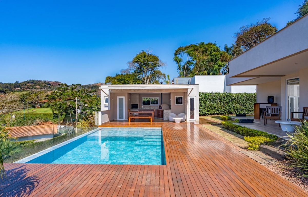 Hospede-se nesta casa super confortável e espaçosa que conta com 5 TV's sendo uma TV de 75" para você assistir a tudo com muito conforto! 4 suítes completas, equipadas com Ar quente/frio. A suíte master ainda conta com cama King, closet espaçoso e vista para piscina e montanhas. Área de lazer com churrasqueira, forno de pizza, sauna e piscina climatizada. Jardim com uma vista incrível Localizada em condomínio seguro e tranquilo, é a escolha ideal para quem busca conforto, segurança e lazer.