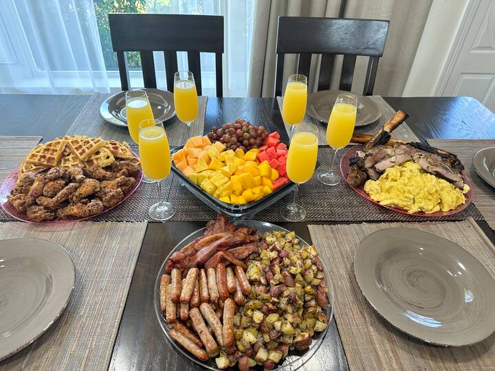 Comienza tu mañana con una cuidada selección de delicias dulces y saladas: esponjosos huevos revueltos, beicon confitado, pollo dorado y gofres, mezclas de frutas tropicales, sémola cremosa, pasteles de mantequilla y café recién hecho. Una celebración del sol caribeño y el confort sureño, elevado con un toque de estilo gastronómico.