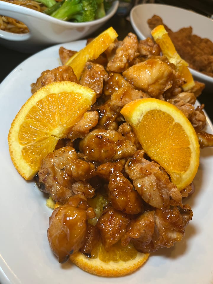 Comida deliciosa y un espectáculo. El menú incluye pollo y camarones, fideos, arroz, verduras, ensalada y empanadillas. (Pregunta sobre la opción de filete.)