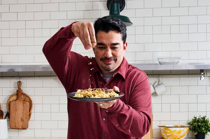 Campeón de Iron Chef. Además, ganador del premio James Beard y autor de dos libros de cocina.